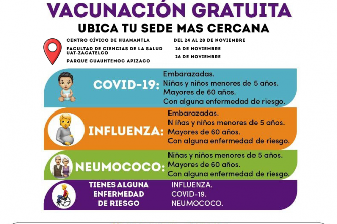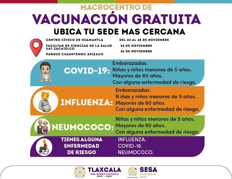 Te invitamos a revisar las imágenes que acompañan esta publicación para conocer las fechas, horarios y puntos específicos donde se llevará a cabo la Macrojornada de Vacunación.